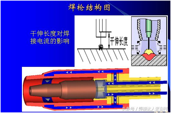 氣保焊的構(gòu)造如上圖所示,在焊接過程中干伸長度的計算是從導(dǎo)電嘴到工件的距離,而不是從噴嘴到工件的距離,根據(jù)電流的大小,干伸長短也有不同的要求,如超出規(guī)范會影響焊接的穩(wěn)定性和焊接質(zhì)量。