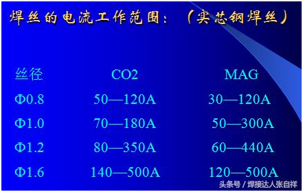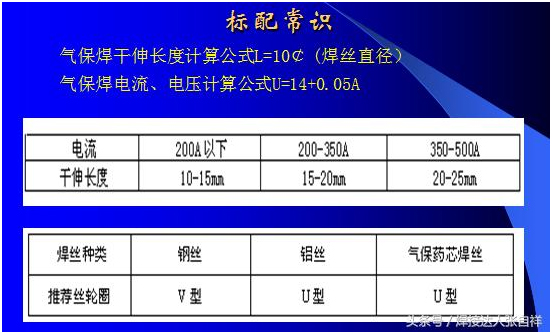 除了以上干伸長度對焊接的要求以外,對于送絲輪的使用可以參照上圖,焊接碳鋼、不銹鋼等實心焊絲采用的送絲輪為V型,焊接鋁合金或藥芯焊絲等材質(zhì)較軟的焊絲可采用U型輪,如果選擇錯誤,可能會出現(xiàn)送絲不暢,參數(shù)匹配有誤等問題,另外,對于焊絲來講,每一種焊絲都有其焊接范圍,比如,如果采用1.2Mm焊絲,要想焊接500A的電流,就是把調(diào)節(jié)電流放到最大500A,也只能出300多安的電流就是這個道理,要想焊到500A,只需要不絲徑加到1.6或更粗的焊絲即可。這也是防止焊機超負(fù)載使用的一個方法,比如采用60%占載率的氣保500焊機,如果長時間焊接,那么根據(jù)公式就只能得出380A以內(nèi)可以長時間焊接,為了避免焊工誤操作,可以選用1.2mm絲徑就不會出現(xiàn)超負(fù)載應(yīng)用了,具體公式算法及焊絲需用電流表如下: