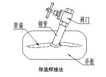 適用于泄漏面積較大或流量較大或壓力較大時的焊接,根據(jù)泄漏處的的形狀制作一塊帶截流裝置的補板。泄漏較為嚴重時,截流裝置用一段導流的管子,在上面裝一個閥門,泄漏較小時,補板上預留一個螺絲帽即可。補板的面積一定要大于泄漏處,截流裝置在補板上的位置一定要正對著泄漏處,補板與泄漏處接觸的一面涂上一圈密封膠,讓泄漏的介質(zhì)從導流管流出,以減少補板周圍的泄漏。補板焊好后,關閉閥門或擰緊螺栓即可。